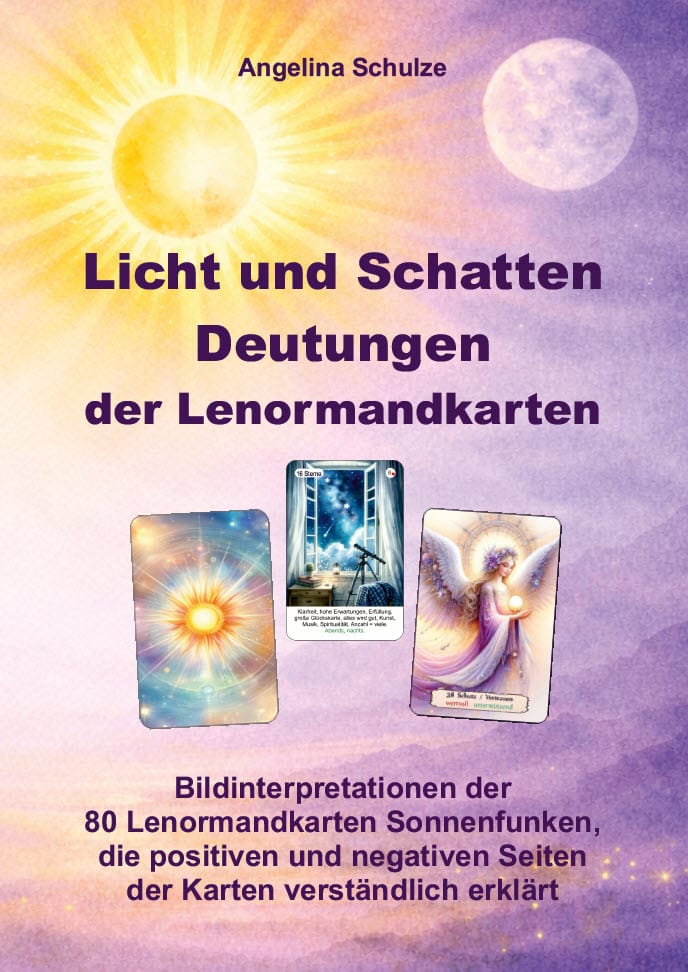 Seit 11 Mai 2025 gibt es meine neuen Lenormandkarten Sonnenfunken in der erweiterten Edition mit 80 Karten. Aktuell nur in meinem Shop und hier auf dieser Webseite. Die ersten Feedbacks habe ich auf dieser Seite auch schon ergänzt. Danke an alle, die mir schon geschrieben haben: