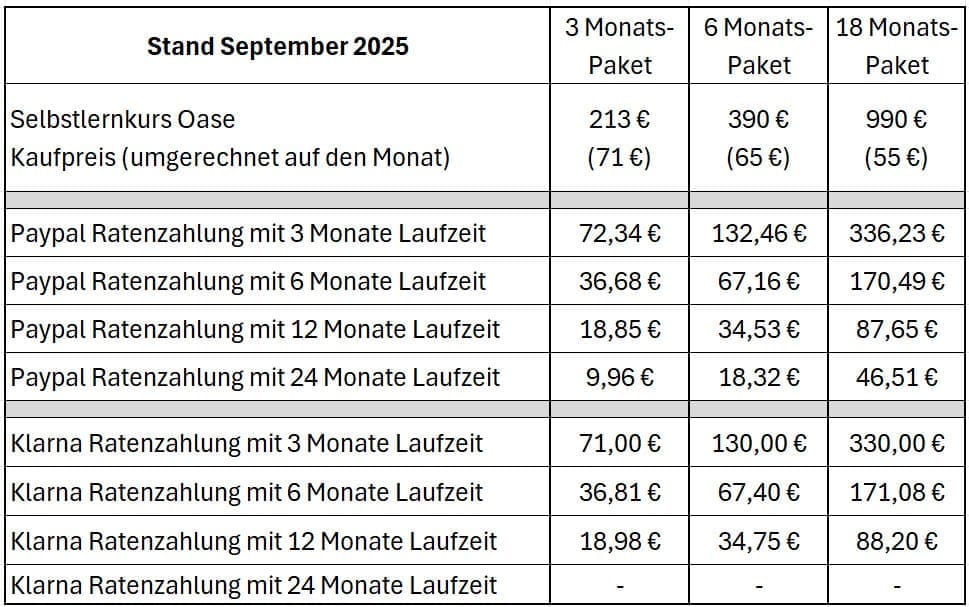 Du kannst im Shop mit Einmalzahlung oder 3 Monate mit Klarna Zinsfrei die oase mit den 3, 6 oder 18 Monaten buchen. Ab 6 Monate Laufzeit ist mit dem Aufschlag der Zinsen Paypal ein bißchen günstiger. Je länger die Laufzeit, umso günstiger wird die Monatsrate. Wähle aus, wie es am besten für dich passt.